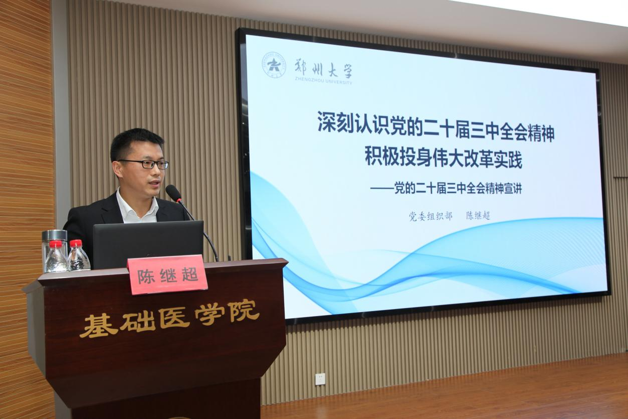 為深入學(xué)習(xí)貫徹黨的二十屆三中全會精神,根據(jù)校黨委統(tǒng)一部署,9月25日,鄭州大學(xué)學(xué)習(xí)貫徹黨的二十屆三中全會精神宣講團(tuán)成員、校黨委常委、組織部部長陳繼超到基礎(chǔ)醫(yī)學(xué)院作宣講報告。學(xué)院黨政班子成員、全體教職工以及部分學(xué)生代表150余人參加。