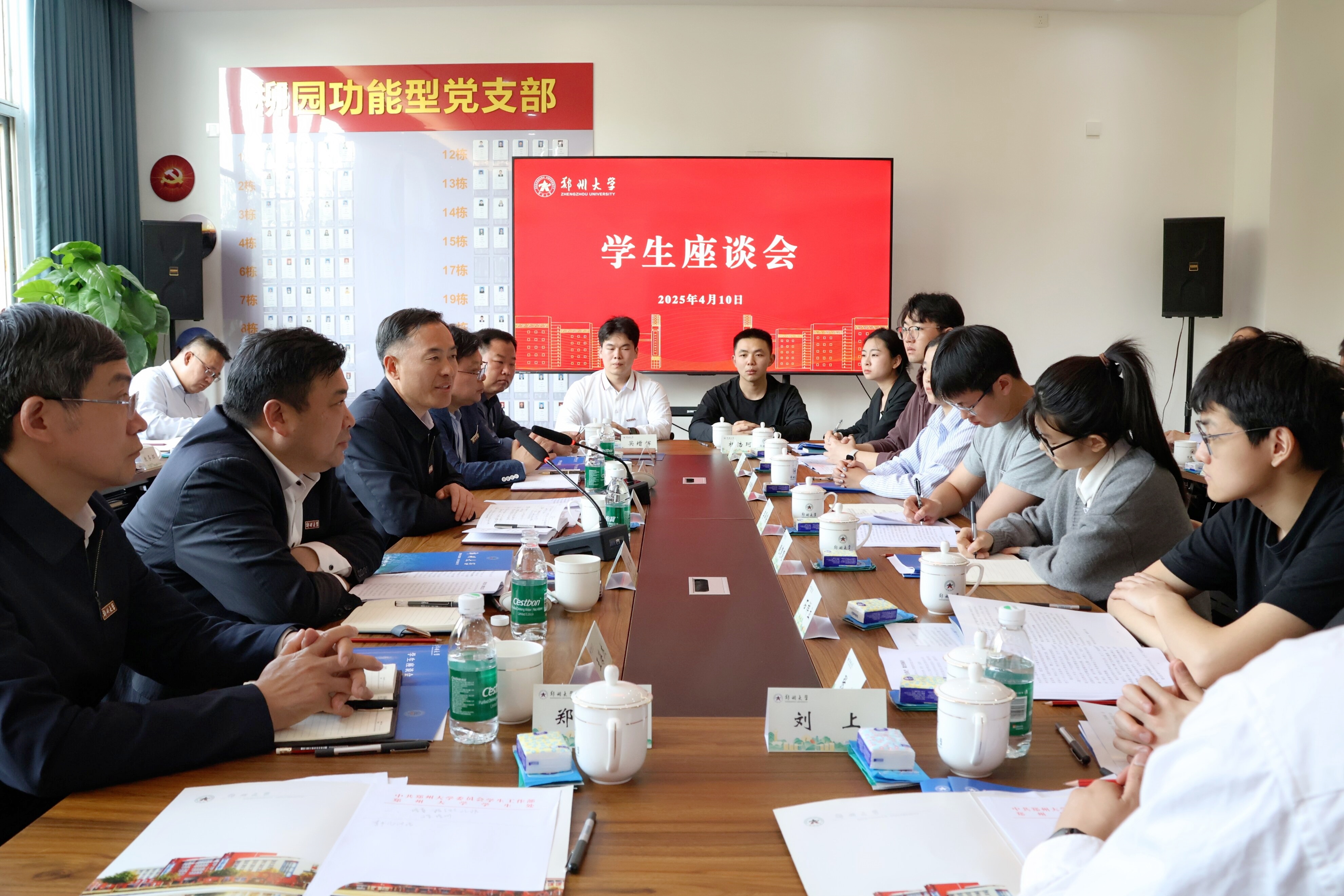 4月10日,鄭州大學在主校區柳園社區黨建活動室召開學生座談會。校領導李成偉、王利國、胡少偉、徐東升、王海杰出席會議,相關職能部門負責同志、學生代表參加會議。