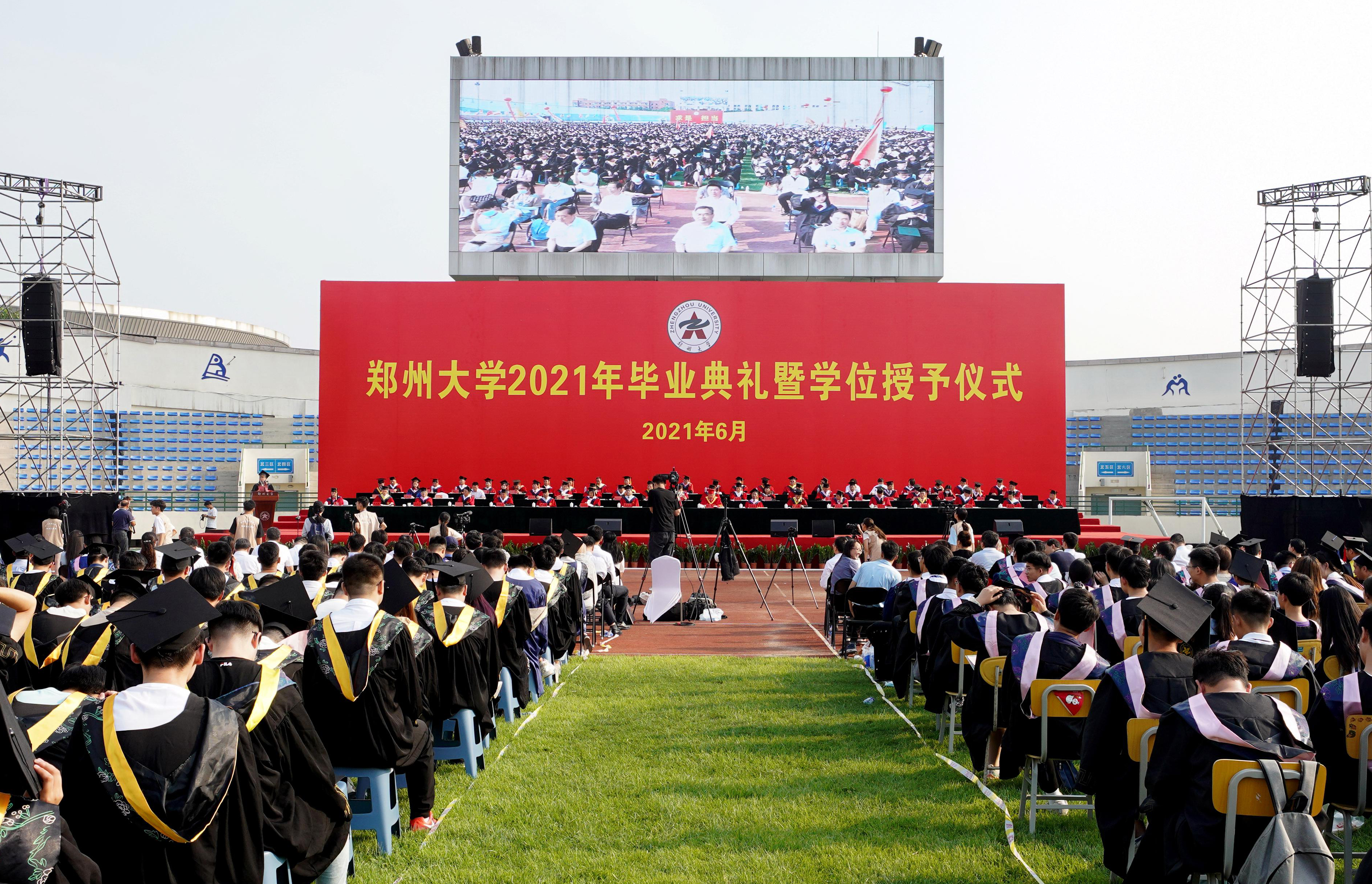 荷葉亭亭綠滿塘,累累碩果滿枝香。6月28日清晨,迎著初升的太陽、沐浴著清爽的晨風(fēng),鄭州大學(xué)1.8萬余名畢業(yè)生身著學(xué)位服在體育場(chǎng)上有序就坐,一個(gè)個(gè)充滿著收獲的喜悅,共同見證完成學(xué)業(yè)的美好而莊嚴(yán)的時(shí)刻。 “從黨史學(xué)習(xí)中汲取奮進(jìn)力量,讓青春在奮斗中綻放絢麗之花。”體育場(chǎng)四周的墻上張貼的一個(gè)個(gè)大紅條幅,若如師長(zhǎng)們一句句語重心長(zhǎng)的教誨。“力行求是,牢記使命共筑新時(shí)代;勇于擔(dān)當(dāng),不負(fù)期望榮耀鄭大人”,一個(gè)個(gè)大紅燈籠飄揚(yáng)在空中,條幅上的文字猶如畢業(yè)生們一句句擲地有聲的誓言。畢業(yè)季恰逢建黨百年,鄭州大學(xué)2021年畢業(yè)典禮暨學(xué)位授予儀式隆重舉行。