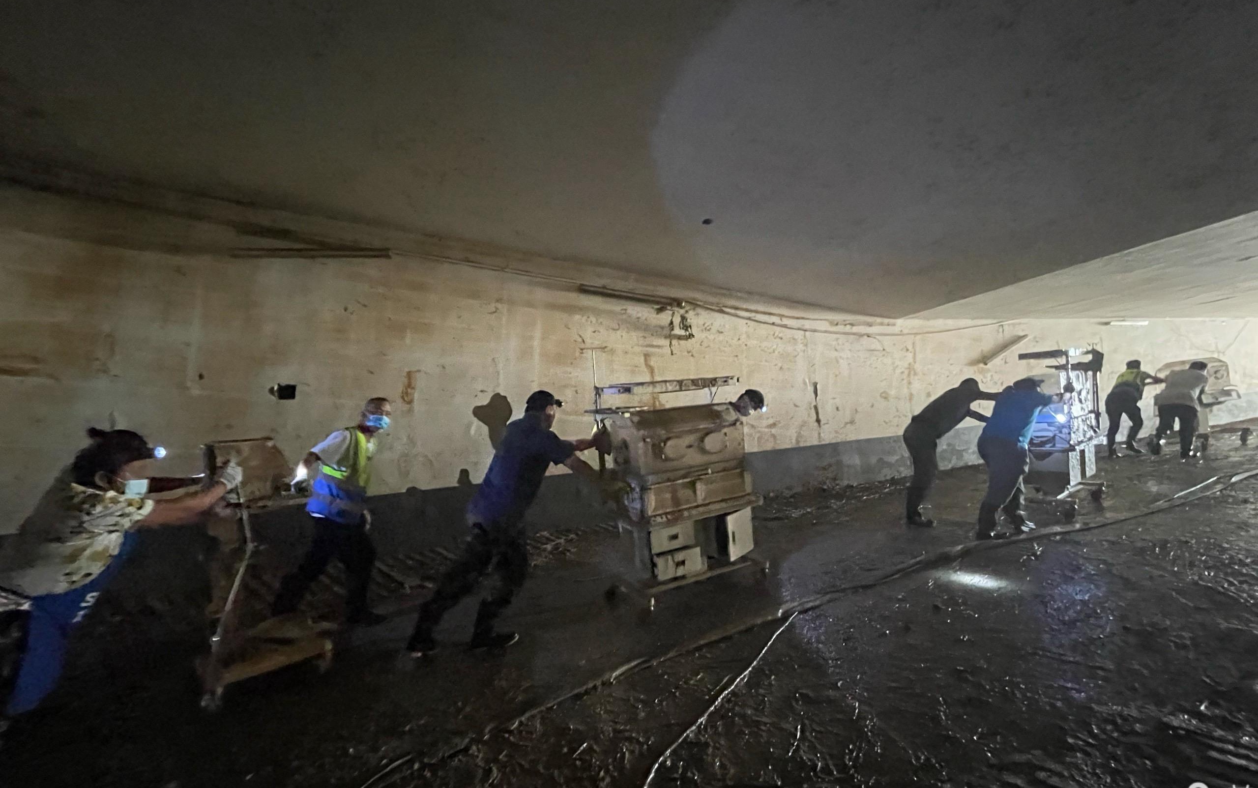 門診樓前發電機轟鳴作響,大廳一米多深的積水在后勤人員持續的排水工作下漸漸消失,供電也逐漸恢復。組織保潔人員清理運送生活和醫療垃圾,在沒有電梯的情況下,將垃圾從病房樓一袋一袋拎下來;抽水后的地下室用了兩天時間才將全部淤泥清理完畢。