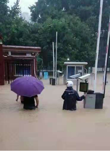 哪里有困難,哪里有需要,哪里就有安保人員的影子。主校區北門崗亭被雨水沖到路邊,安保人員積極進行復位;大水把窨井蓋沖錯位,安保人員第一時間排查隱患恢復原位,并在塌陷區域,拉起警戒線;自行車凌亂地倒在地上,是安保隊員逐一歸位并擺放整齊;為防止大災之后有大疫,安保人員對校園大門進行了全面消殺……他們的身影忙碌在校園里,同時也深深地鐫刻在師生心中。